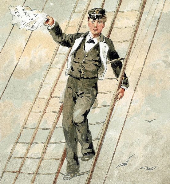 מלח נשען על רכסות וחווקי התורן. ציור על ברכה לשנה החדשה מאת A. Ackermann, לונדון, 1881. מקור: wikimedia commons