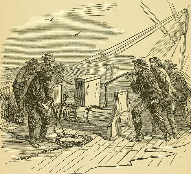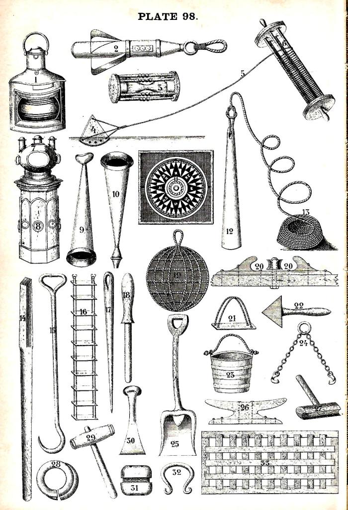 פרטי ציוד שונים באונייה. מקור: Paasch, Illustrated Dictionary of the Marine, 1890. העתק: wikimedia commons. 1. אור צד; פנס צד. 2. לוג פטנטי. 3. שעון חול של הלוג. 4. גזיר העץ של הלוג. 5. חבל הלוג. 6. סליל הלוג. 7. בית המצפן. 8. כַּן המצפן. 9. חצוצרת דיבור. 10. שופר ערפל. 11. מצפן. 12. אנך עומק; אנך למים עמוקים. 13. חבל האנך. 14. ידית הכנן. 15. אונקל לשרשרת. 16. סולם חבלים (לדופן). 17. דקר חבלים. 18. פין שליבה. 19. פֶנְדֶר משעם (פָּגוֹשׁ). 20. מוביל חבל. 21. כיסא רב מלחים. 22. מַגְרֵד (סקרייפר). 23. דלי. 24. אונקלי חביות. 25. יעה לזְבורית. 26. ברווז. 27. מקבת ליפוף חבלים. 28. עִזְקָה. 29. מקבת סתימה. 30. מפסלת סתימה. 31. גולת ראש התורן. 32. טבעת התורן. 33. שְׂבָכָה, סוֹרֵג.