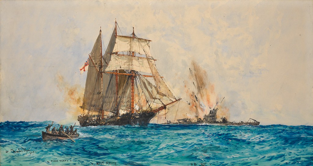 הסקונר First Prize, אוניית-Q בריטית, תוקף בהפתעה את הצוללת הגרמנית U-98, אפריל 1918. ציור מאת צ'רלס אדוארד דיקסון, 1923 או 1925. מקור: wikimedia commons