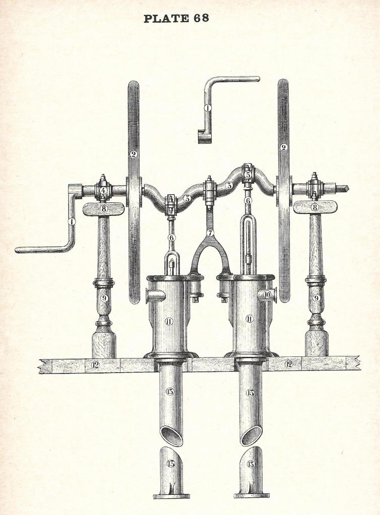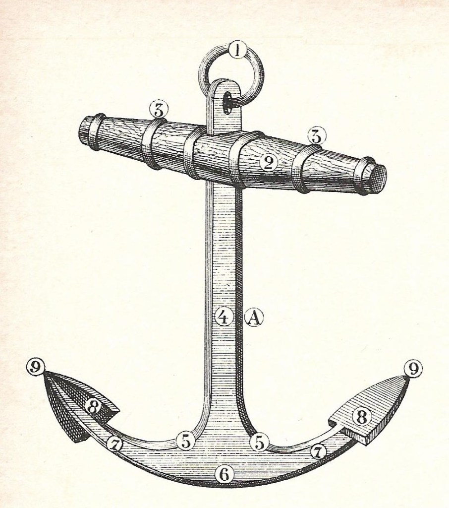 איור 571: זקפי העוגנים – (a) קורה רוחבית, (b) חבל עוגן שמאלי, (c) זקף, (d) חבל עוגן ימני, (e) חבלי עֶצֶר; איור 574: (h) חבל סחב, (i) עין קלועה בקצה חבל הסחב, (k) חבל העוגן השמאלי, עובר מעל מעטר הכווה אל מחסן חבל העוגן, (l) כנן, (m) מקום אחיזת הידיים בחבל הסחב; איור 573: מעצור שרשרת העוגן (devil's claw); איורים 575, 576, 577: מַתְפֵּסִים; איור 578: חבל מעצור (jigger) באוניית מפרשים מסחרית, המצוידת בכננת עוגן ולא בכנן. מקור: Lever, Darcy. The young sea officer's sheet anchor, 1843. עותק סרוק: Internet Archive.