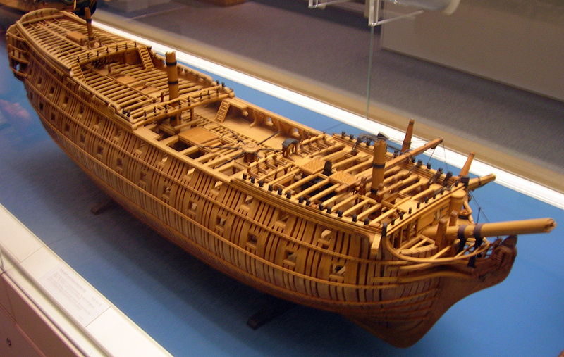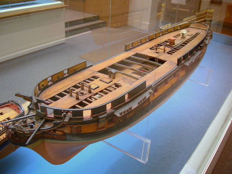 סיפון האחרה, סיפוני המותניים מימין ומשמאל וסיפון הקדמה של פריגטת 40 תותחים מ-1810 לערך. דגם באוסף המוזיאון הימי הלאומי גריניץ'. מקור: wikimedia commons.