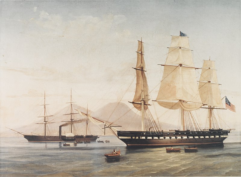 מימין: פריגטת המפרשים USS Congress, משמאל פריגטת הקיטור USS Susquehanna בנאפולי. ציור מאת Tomaso De Simone, שנה: 1857. מקור: U.S. Navy Art Collection. העתק: wikimedia commons