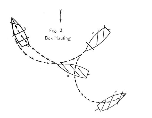 1. סיבוב מול הרוח וחילוף המפנה (a – היכון לסיבוב! b – האונייה מתקרבת אט-אט לרוח. c – האונייה מול הרוח, סיבוב סקריות התרנים הראשי והאחורי. d – האונייה במפנה החדש, סיבוב סקריות התורן הקדמי.) 2. סיבוב עם הרוח וחילוף המפנה. 3. סיבוב לאחור עם הרוח וחילוף המפנה. מקור: Knight, Austin M., Modern Seamanship, 1901. Plate no. 134. עותק סרוק: Internet Archive.
