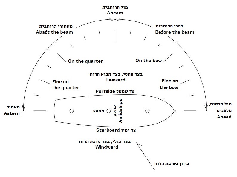מימין לשמאל: חוף הַגְּלִי (החוף בצד הגלוי לרוח של האונייה), אונייה בַּחֲסִי החוף (בסתרו של החוף), אונייה בחוף הַחֲסִי, חוף הַחֲסִי (החוף בצד החסוי מן הרוח של האונייה). מקור: A. Ansted, A Dictionary of Sea Terms, 1898 . עותק סרוק: internet archive.