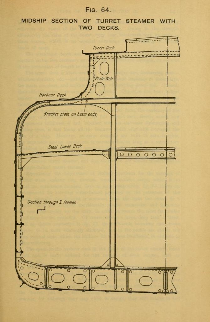אוניית הצריח האוסטרו-הונגרית "קרונפרינץ ארצרצוג רודולף", 1887. מקור: wikimedia commonsאוניית הצריח המסחרית הבריטית Turret Age, הושקה ב-1893. מקור: wikimedia commonsחתך רוחב של אוניית משא כללי בעלת סיפון צריח. מקור: T. Walton, Steel Ships: their construction and maintenance, 1901