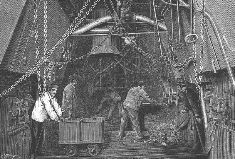 פועלים טוענים זבורית חצץ באונייה בנמל לונדון. מקור: איור בספר, 1861. העתק: wikimedia commons.