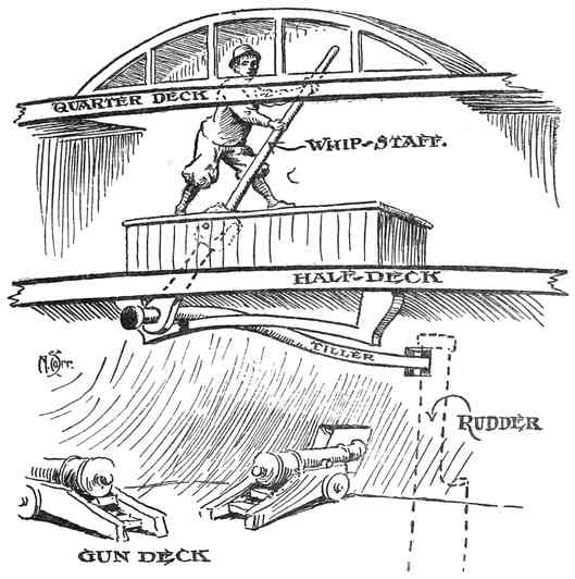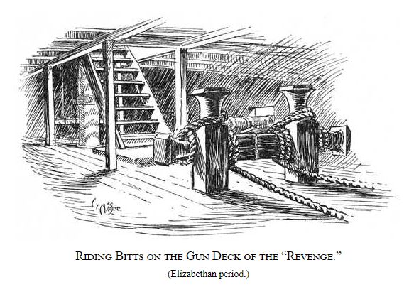 זקפי העוגנים על סיפון התותחים של "ריוונג'", גליאון אנגלי מסוף המאה ה־16. מקור: E.K. Chatterton, Ships & Ways of Other Days, 1913. העתק סרוק: Project Gutenberg.
