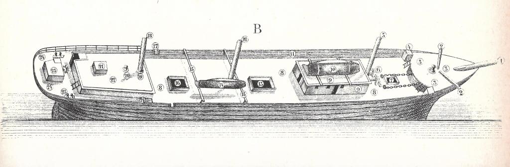 1. מוט החרטום; 2. מדלה העוגן; 3. סיפון הקדמה; 4. מחסן ציוד או בית כיסא; 5. תורן קדמי; 6. זקפים למיתרי המפרשים העיליים; 7. כווה קדמית; 8. סיפון עליון; 9. בית סיפון; 10. סירה ארוכה; 11. מעקה הסיפון; 12. תורן ראשי; 13. כווה ראשית; 14. גיג; 15. כַּנּוֹת לסירת שירות; 16. כווה אחורית; 17. פתח במעקה (בָּב); 18. תורן אחורי; 19; אנפילת התורן; 20. כנן; 21. צוהר הקבינה; 22. בית סיפון אחורי; ובו קבינה וכו'; 23. בית ההגה; 24. סיפון בית האחרה; 25. זְקֵפֵי רתיקה. מקור: Paasch, Illustrated Marine Encyclopedia, 1890. העתק: wikipedia commons.