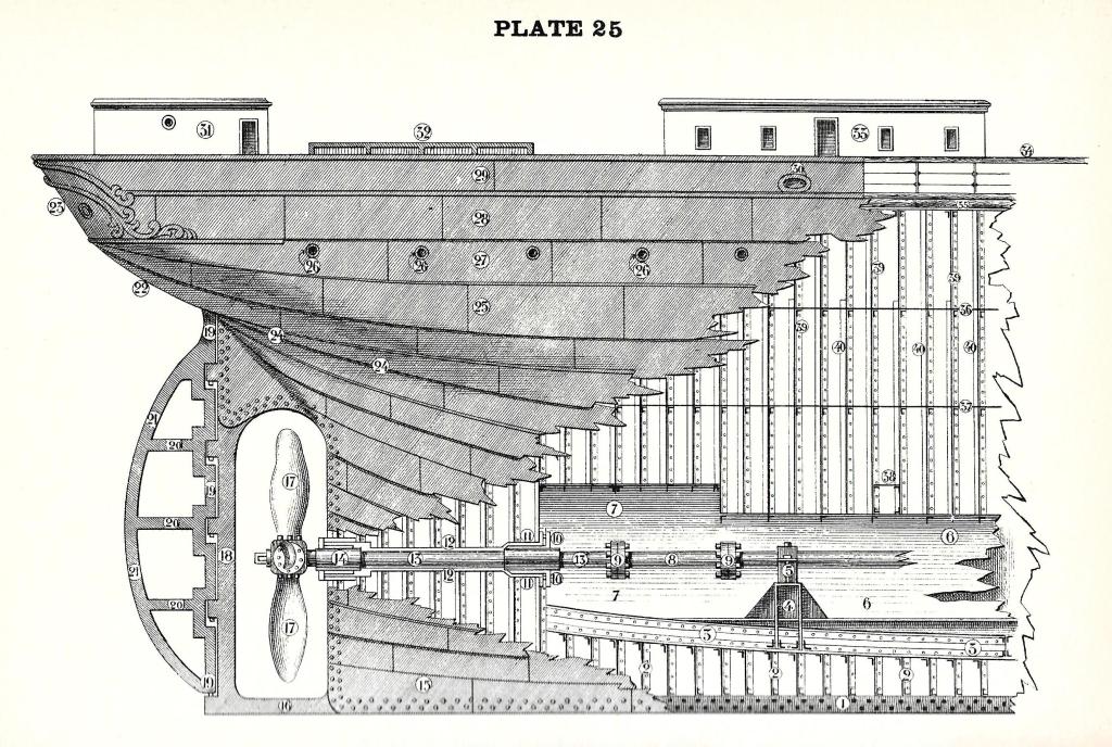 חתך אורך של אוניית קיטור. 1. ארובת עשן; 5. ארובת אוורור למסקה; 6. צוהר חדר המכונות; 7. מסוכת המנוע; 8. מסוכת המסקה; 9. מסקה; 10. מחיצה קדמית; 11. רצפת המסקה; 12. מובַל עשן; 13. דוד קיטור; 18. מנוע; 20. ו־23. מי נטל בתחתית כפולה; 24. מנהרת הציר; 26. מסב דחף; 30. מסבים נושאים; 33. גובתת מילוא; 35. צינור ירכתיים; ציר המדחף וכו'; 36. מדחף; 38. מזוזת המדחף; 39. מזוזת ההגה; 40. לוח ההגה; 41. מסוכת מכונת ההגה. Paasch, Illustrated Marine Encyclopedia, 1890, pl. 43. העתק: wikimedia commons.