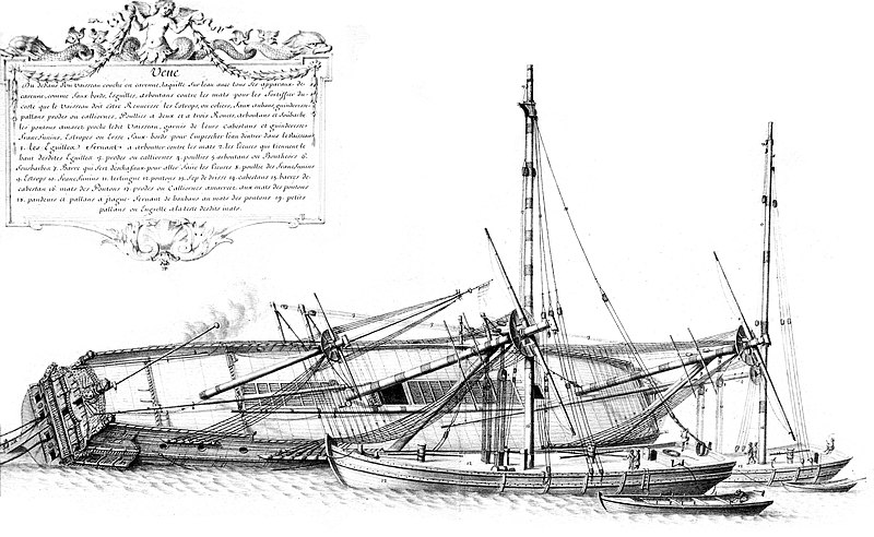 הקורבטות L'Astrolabe ו- La Zélée מוטות על צדן בשעת השפל לצורך תיקונים. ליתוגרפיה מאת Louis Le Breton, Auguste Étienne François Mayer, שנה 1846. מקור: wikimedia commonsהטיית אוניית מלחמה בנמל לתיקונים ולניקוי התחתית. תחריט מתוך L'Album de Colbert, 1670. העתק: wikimedia commons.