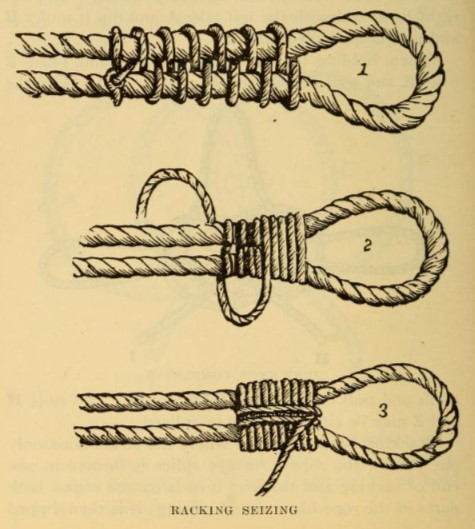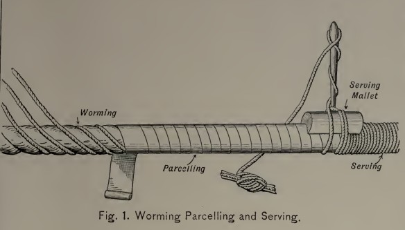 מילוי הרווחים, חבישה וליפוף של חבל עבה נייח. מקור: A.M. Knight, Modern Seamanship, 1901.