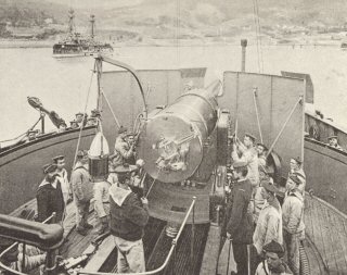 דוכניות ירי עגולות על תרניה של אוניית המערכה היפנית "שיקישימה", 1905. מקור: wikimedia commons