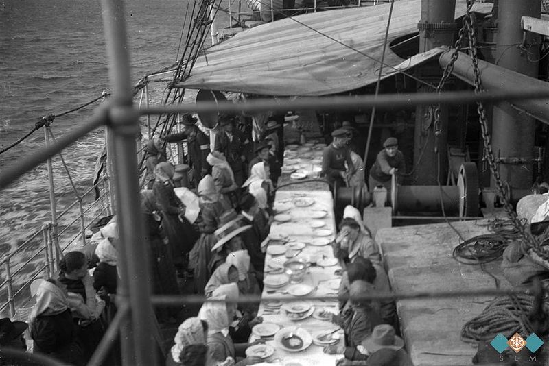 הננו מתכבדים להודיע להקהל כי החברה הגדולה הזאת קבעה אניות מסע למהגרים מא"י החפצים לנסע לאמריקה הצפונית או לאמריקה הדרומית.