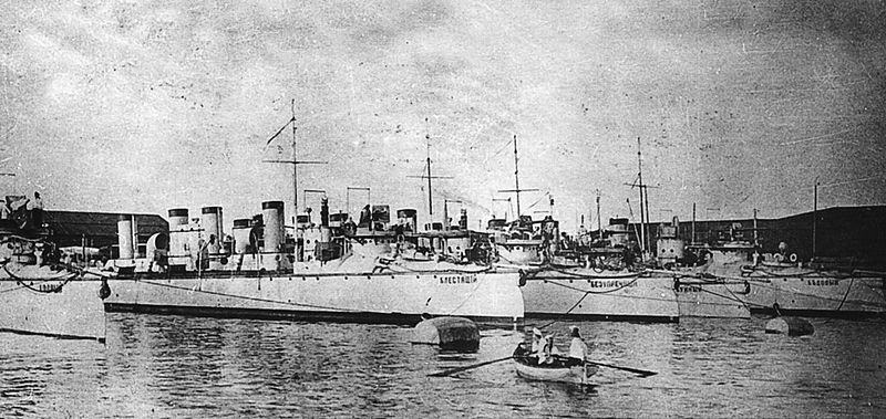 „את יתר 14 אניות-המלחמה הגדולות נוכל לחלק לשתי מחלקות בנוגע למטרה הנכונה להן. במחלקה הראשונה נכללות האניות שבנינן חדש אם מעט ואם הרבה (אך לא יותר מן 6–8 שנים), והן ממלאות כל דרישות העת החדשה. כאלה הן חמש הרצות הלובשות שריון: „אלכסנדר III“, „באָראָדינאָ“, „אָרעל“, „סובאָראָוו“ „אָסליאַביאַ“ וכל הרצות שמכסהן מצופה שריון. במחלקה השניה, אניות עתיקות, יש לחשוב את השריוניות: „נאווארין“ ו„סיסוי הגדול“ ואת הרצות הלבושות שריון „אדמירל נאחימוב“ ו„דמיטר הדוני“.