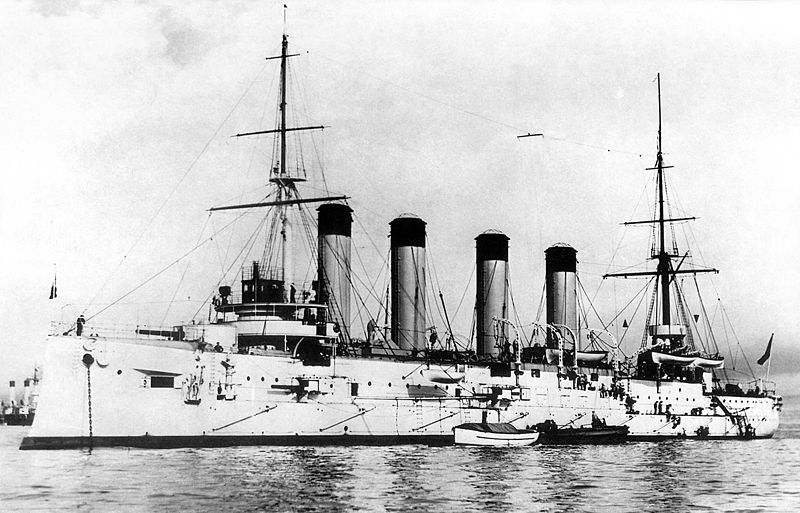 ובשעה 8 וארבעים חלקים בבוקר נראתה אסקדרה יאפאנית של תשע אניות שריון, ועל כן שבו אניותינו אל פורט-ארטור, ושם בנמל החיצון נספחו אליהן גם אניות „פאביעדא“, „פערעסוויעט“ „סיבסתופול“, אשר יצאו מן הנמל הפנימי. אח"כ הסתדרה האסקדרה שלנו באופן זה, כי האניות „אסקולד“, „באיאן“, „דיאנא“, „פטרופבלובסק“, „פערעסוויעט“, „פאביעדא“, „נאוויק“ וחמש אניות טורפידין ושתי אניות מרוץ של טורפידין היו משמאל. ויהי כאשר נקרבו אל מבוא הנמל נצטוו אניות הטורפידין להכנס אל הנמל פנימה, ואניות המרוץ נצטוו לבוא אחריהן.