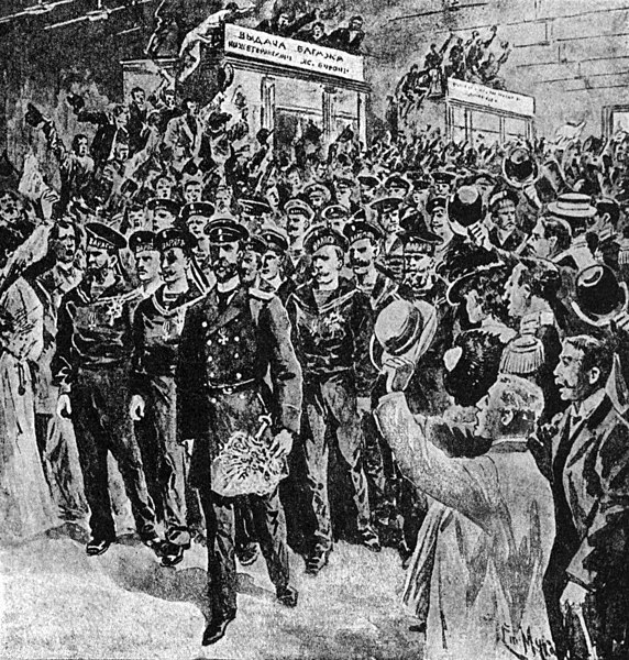 אדיסא. התגברות הרגשות הפטריוטיות בין התושבים לרגלי בוא הספנים הגבורים, היא באמת לעילא ולעילא. בכל מקום שיתראו יעשה למו ברגע פומבי ביקר כל כבוד. הנהגת העיר נתנה כבוד לספנים בעריכת ארוחת בקר. אחרי הארוחה הלכו במקהלת נוגנים אל החוף, לאניה „ניקולאי“, אשר בשעה 4 אחרי הצהרים הלכה לסיבסתופול. אל ההליכה בסך נלוה המון גדול, עד כי הנמל לא יכול להכילם. כל מסבי רחוב החוף מלאו המונים.