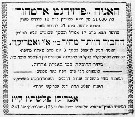 האניה „פרזידנט ארטור“ חתמה חוזה עם ממשלת אמריקה להובלת הדואר מאמריקה לא"י בזמן נסיעת האניה.
