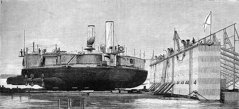 אוניית השריון העגולה "אדמירל פופוב" במספנת הצי בניקולאייב, 1878. איור ב-The Graphic. המקור: ויקישיתוף