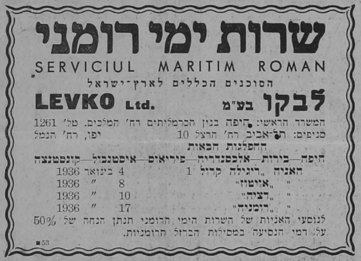 חברת „לויד ימי ארצישראלי“ נוסדה על־ידי איש־הים המנוסה מר ברקוביץ מרומניה. אניותיה של החברה, „הר ציון“ ו„הר הכרמל“, שהיו מפליגות בקביעות תחת הדגל הארצישראלי בין חיפה וקונסטאנצה, הצליחו להתחבב על הציבור העברי בארץ ובגולה. „הר הכרמל“ עלתה באש לפני זמן מה. הנהלת החברה עומדת לפני קניית אניה חדשה גדולה, שתעלה על הנשרפת בגדלה ובנוחיותה. הנהלתה החברה, שקיבלה בהכרת טובה את ספר התורה, לפי הצעת „הצופה“ מאת הגב' שיינדיל שאַנץ, הבטיחה להנהיג תחת השגחת הרבנות הראשית מטבח כשר וההכנות התחילו.